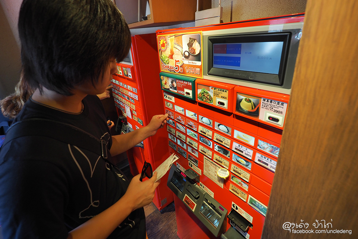 เมื่อถึงคิวแล้ว... ก่อนเข้าร้าน จะมีจะมีตู้จำหน่ายราเมง ให้เราหยอดเหรียญ หรือใส่ธนบัตร เข้าไปในเครื่อง และเลือกซื้อบะหมี่ และอาหารต่างๆ ได้ เมื่อกดเลือกรายการอาหารเป็นที่เรียบร้อย เครื่องก็จะคิดเงิน และทอนเงินออกมาจากเครื่อง พร้อมตั๋วระบุชื่ออาหารที่เราสั่ง