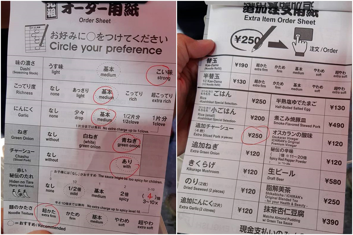 วิธีการสั่งราเมง : ทุกที่นั่งจะมีกระดาษ "ข้อสอบ" ให้เราเลือกทำเครื่องหมายต่างๆ
