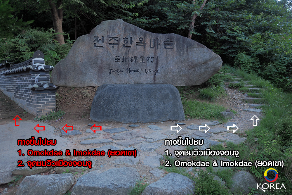 ทางขึ้นด้านซ้าย (ลูกศรสีแดง) จะเป็นเนินสูงเดินขึ้นไปเรื่อยๆ จะเป็น 4 แยก ให้เดินไปทางขวามือ ก็จะเห็น "โอโมกแด - อีโมกแด" Omokdae & Imokdae