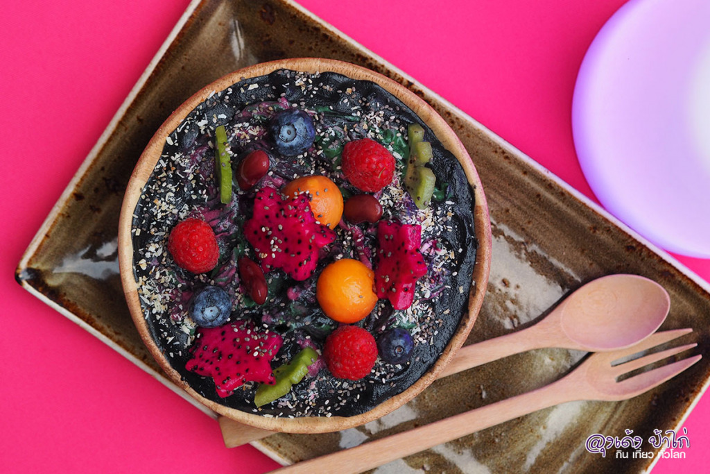 THE GALAXY (Charcoal Detox) 250.- : mixed berries, low-fat yoghurt, strawberry purée, granola and pasteurized milkbanana, strawberry, mango, charcoal, honey and coconut juice topped with fresh fruit, chia seeds, coconut flakes, granola, sunflower seeds and kidney beans