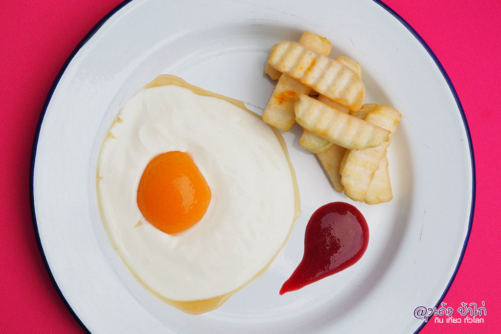 ห้ามพลาด ... Egg & Fries เมนู หลอกสายตา เกินคาดเดา จานนี้ไม่ใช่ "ไข่ดาวทอด เฟรนช์ฟรายส์ กับ ซอสมะเขือเทศ" แต่เป็น - ไข่ดาว ทำจาก กรีกโยเกิร์ต - ไข่แดง แอปปริคอตเชื่อม - น้ำมัน ทำจาก น้ำผึ้ง เสิร์ฟพร้อมกับ มันฝรั่งทอด ที่ทำจาก ฝรั่งสด หั่นแบบมันฝรั่งทอด เหมือนจริงๆ สุดๆ