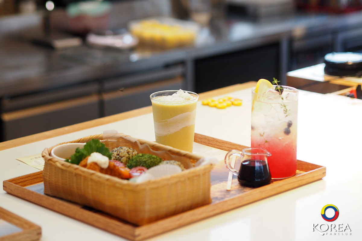 น้ำผลไม้ มีหลายชนิดให้เลือกชิม รวมถึงของว่าง อาหารคาวเบาๆ ก็มีให้เช่นกัน