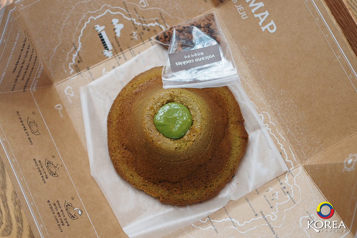 ตอนที่ซื้อ ทางร้านจะใส่ในกล่องกระดาษมาให้ เมื่อแกะออกมาแล้ว ตรงกลางจะเป็นภาพวาด เกาะเชจู และมีเค้กภูเขาไฟก้อนนี้อยู่ตรงกลาง พร้อมด้วยขั้นตอนวิธีการโรย Topping เพื่อให้มีรูปร่างเหมือนภูเขาไฟลาวาประทุ (สีเขียวตรงกลาง คือซอสชาเขียว) คุ้กกี้กรอบก้อนเล็กๆ เปรียบเสมือนหินวาลา ก้อนเล็กๆ