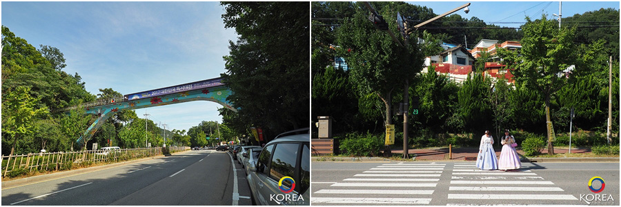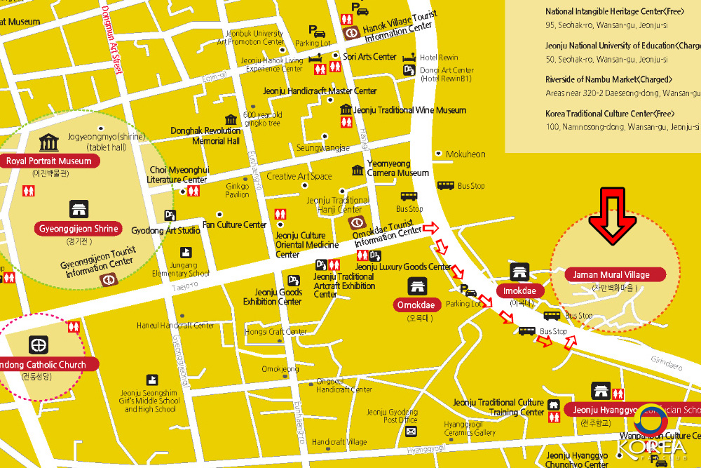 การเดินทาง : หมู่บ้าน Jaman Mural Village อยู่ไม่ไกลจาก หมู่บ้านโบราณ (Jeonju Hanok Village) ใช้เวลาประมาณ 15 นาที โดยเริ่มจาก ศูนย์ข้อมูลท่องเที่ยว (Hanok Village Tourist Information) ถนน Taejo-ro เดินตรงไป 3 แยก แล้วเลี้ยวขวา เดินไปไม่ไกล จะเห็นสะพานสีสวยๆ ขึ้นสะพานนี้ก็ถึงเลย หรือจะเดินต่อไปอีก นิดหน่อยก็จะเป็นทางม้าลาย ฝั่งตรงข้ามก็คือ หมู่บ้าน Jaman Mural Village “หมู่บ้านหลากสี”