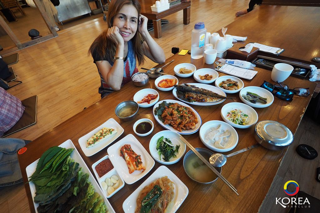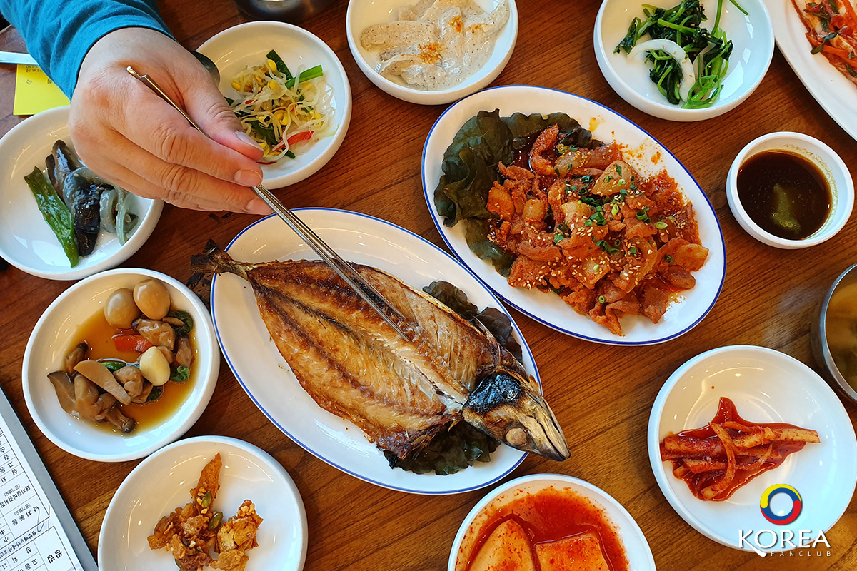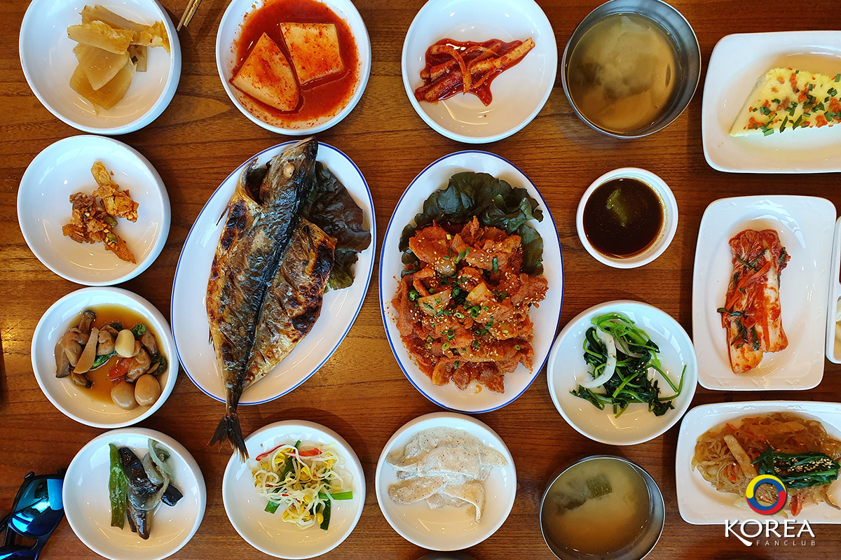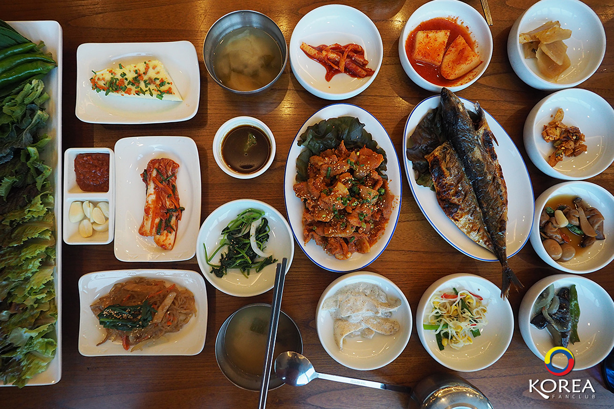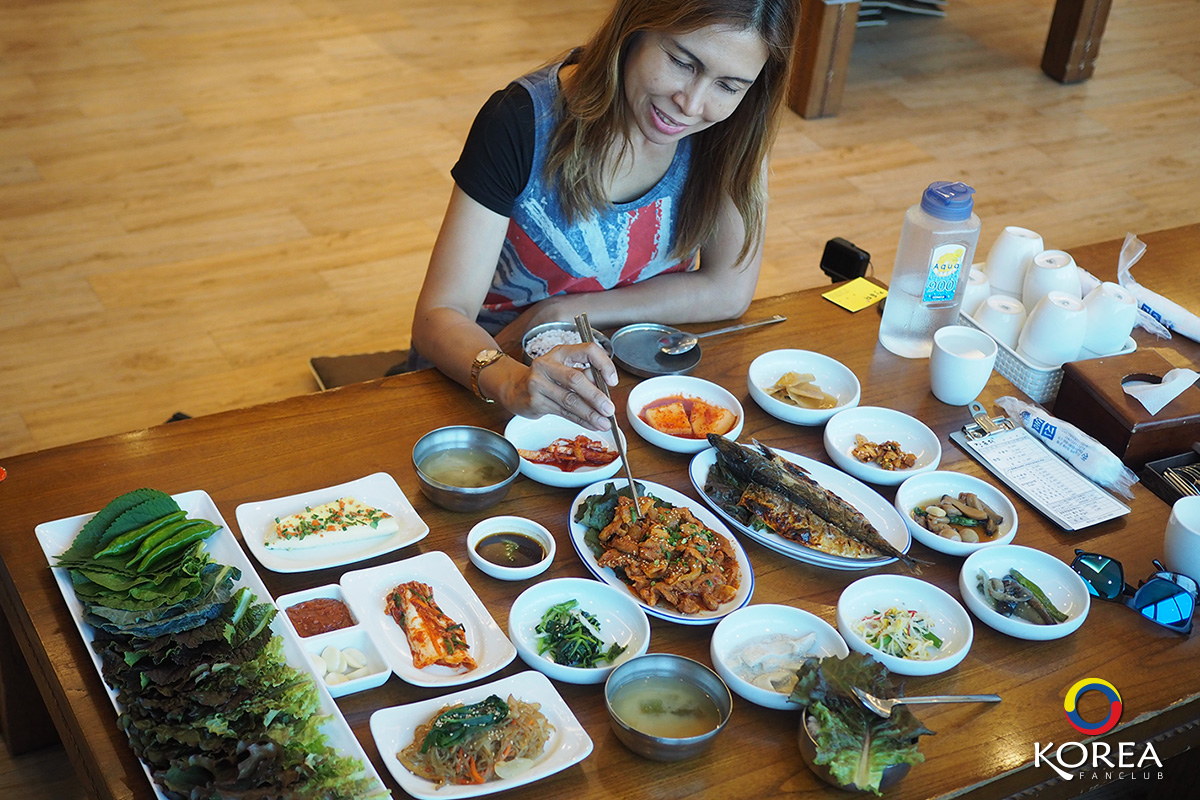 ลุงเด้งป้าไก่ มากัน 2 คน ก็สั่ง อาหารหลัก คนละ 1 จาน ลุงเด้ง สั่ง ปลาแมคคอเรล (ปลาโอ) ย่างเตาถ่าน ป้าไก่ สั่ง หมูผัดพริกเกาหลี นอกนั้นที่เห็นวางเต็มโต๊ะ คือ เครื่องเคียง ประมาณ 15 ชนิด (เรียกว่าวางกันเต็มโต๊ะเลยล่ะครับ)
