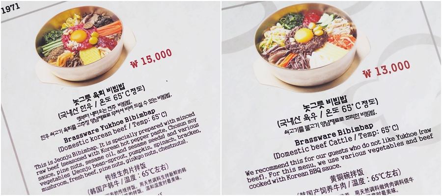 ลุงเด้งเลือกสั่ง Brassware Yukhoe Bibimbap : บิบิมบับ เนื้อดิบ (เนื้อวัวเกาหลี) เสิร์ฟในชามทองเหลืองร้อน ที่อุณหภูมิ 65 °C ราคา 15,000 วอน ครั้งแรกที่กิน บิบิมบับ เนื้อวัวดิบ - อ่านในเมนู เสิร์ฟในชามทองเหลืองร้อน ที่อุณหภูมิ 65 °C คือมันแค่อุ่นๆ เอามือจับยังได้เลย คิดว่าเนื้อจะสุก 555 งานนี้กินดิบๆ สดๆ เลย ... เฮ้ยยยยย อร่อยอ่ะ
