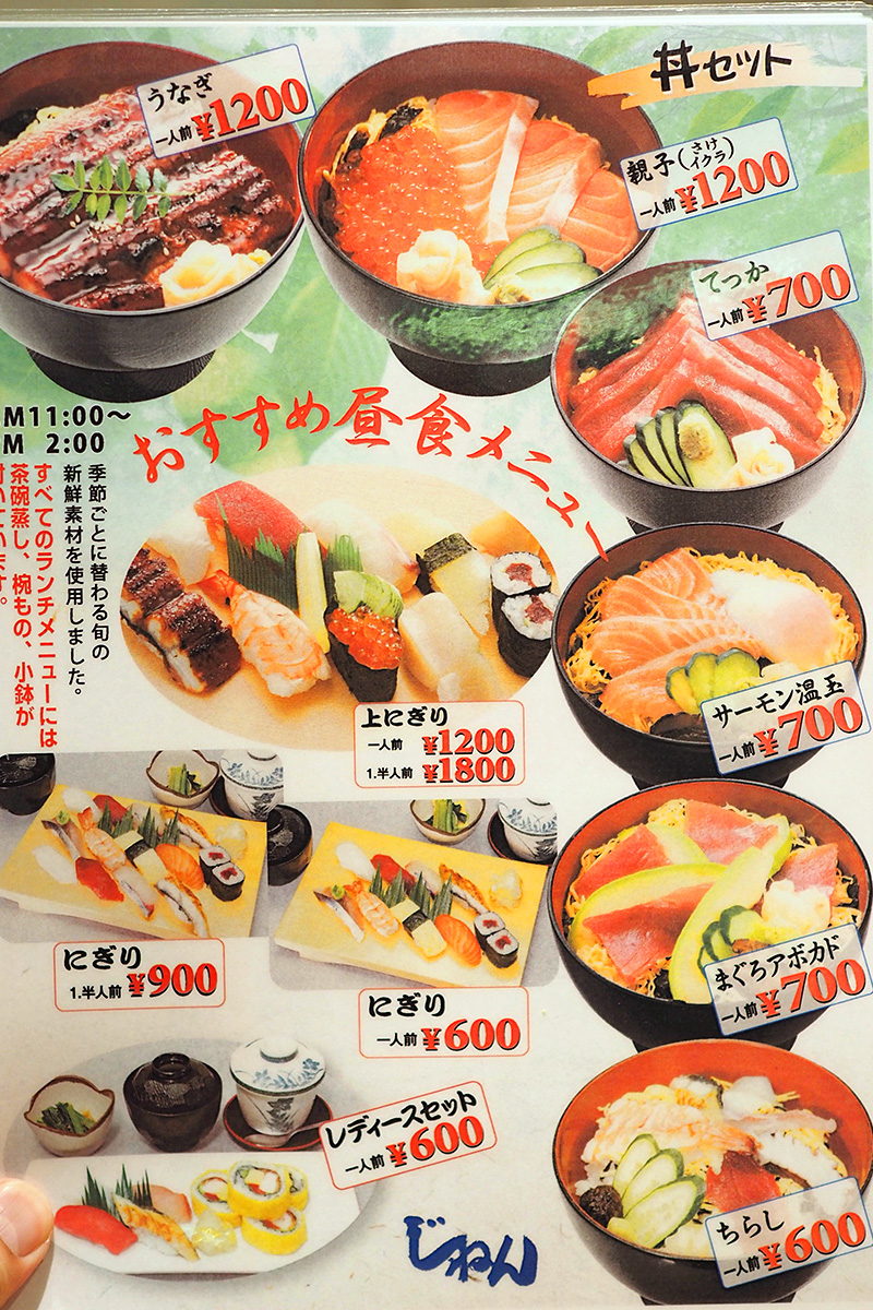 Jinen Shimizucho ร้านซูชิ โอซาก้า ที่มี ชุดอาหารกลางวัน ราคาประหยัด ขายตั้งแต่เวลา 11:00-14:00 เท่านั้น ราคาเริ่มต้นที่ 600 เยน เท่านั้น