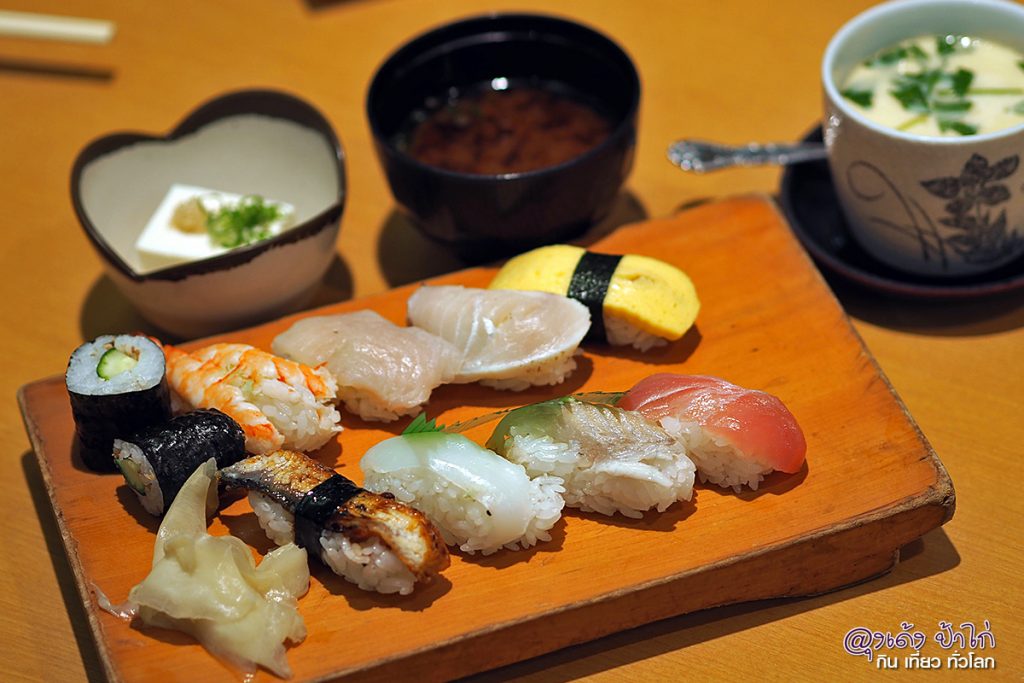 ชุดนี้ของลุงเด้ง ราคา 900 เยน : ชูชิ 8 คำ + มากิ 2 คำ + ไข่ตุ๋น + เต้าหู้เย็น + ซุป คิดเป็นเงินไทย ประมาณ 250-270 บาท เท่านั้น