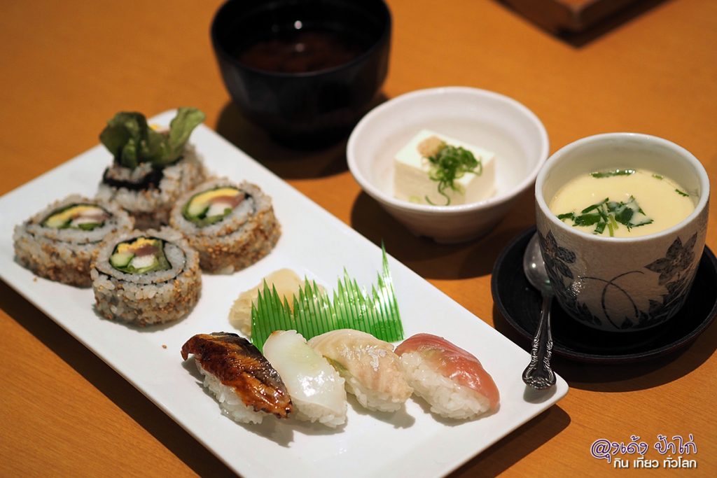 ชุดอาหารกลางวัน : ป้าไก่สั่งชุดถูกที่สุด ราคา 600 เยน ในชุดจะมี ซูชิ 4 คำ + มากิ 4 คำ + ไข่ตุ๋น + เต้าหู้เย็น + ซูป ตามในภาพนี้เลย คิดเป็นเงินไทยก็ประมาณ 170-180 บาท เท่านั้น