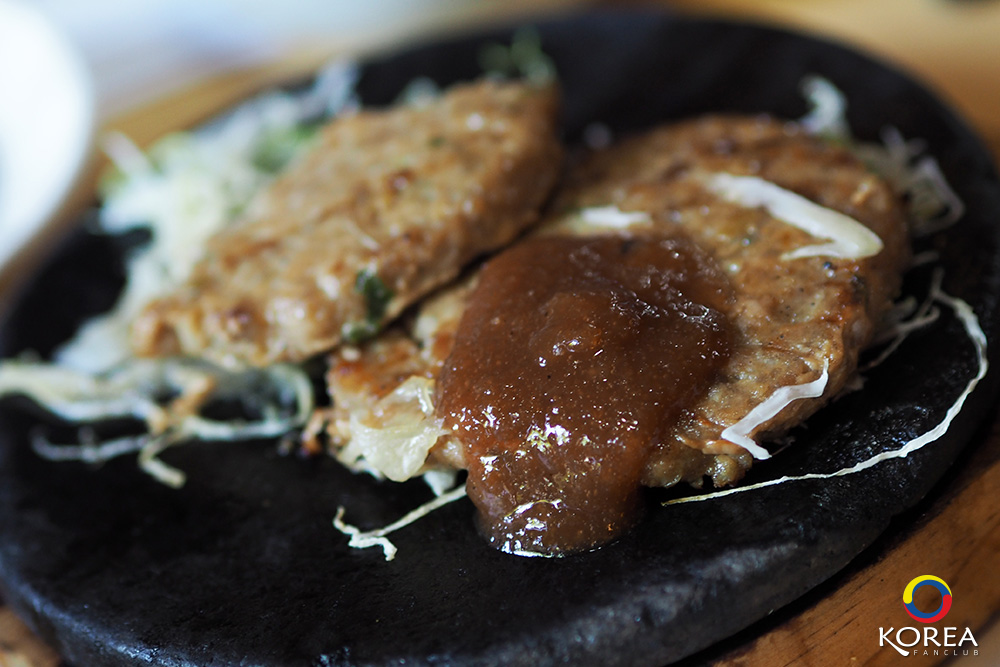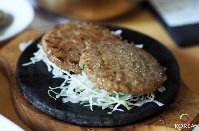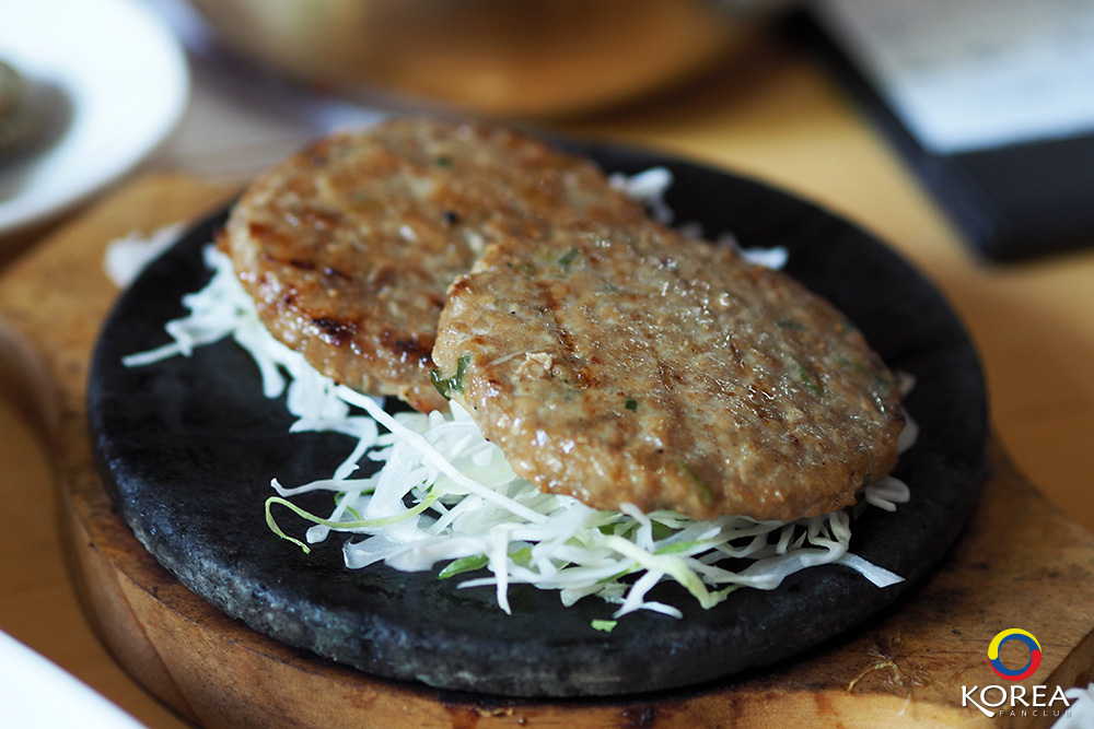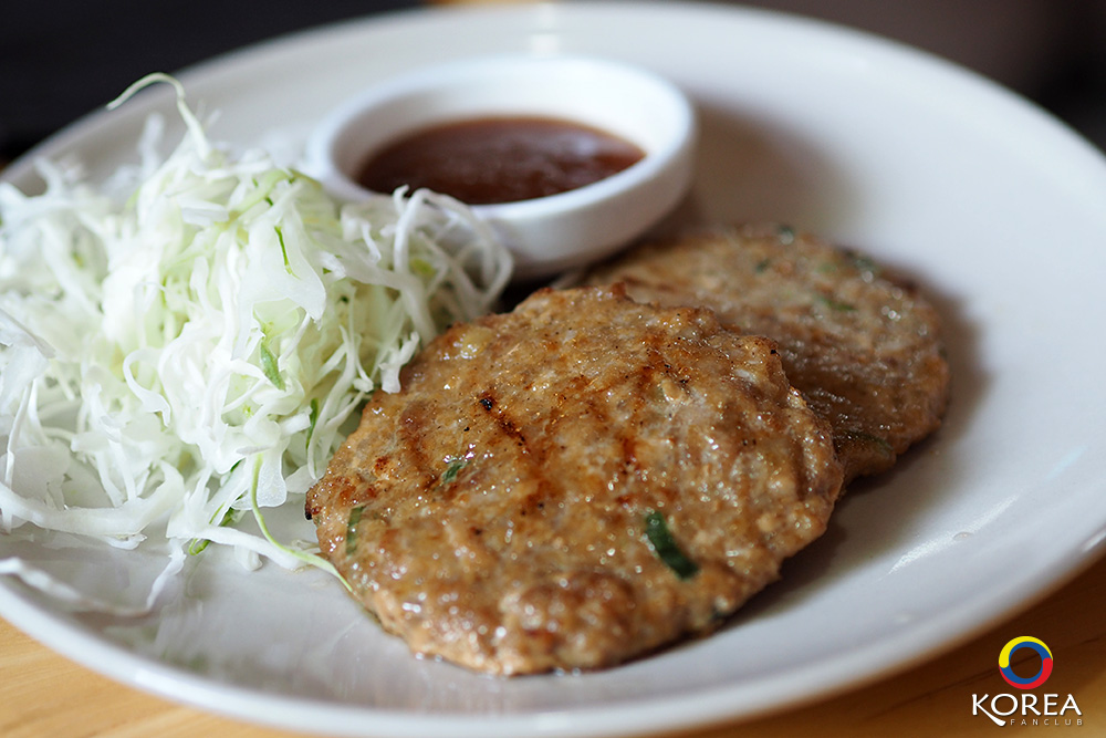 Ttoek Galbi (떡갈비) หรือ เบอร์เกอร์หมู 2 ชิ้น จะเสิร์ฟมาแบบอุ่นๆ ในจานนี้