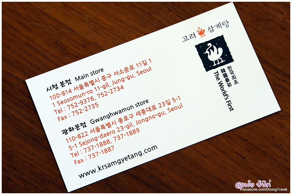 ลุงเด้ง ป้าไก่ เดินทางไปกินที่แนะนำสาขาใหญ่ เดินทางสะดวก ออกจาก สถานี City Hall ทางออก 10 เดินตรงไป 100 เมตร (ไม่เกิน 2 นาที) ร้านอยู่หัวมุมถนน Seosomun-ro 11-gi สังเกตง่ายมาก เมนูเด่นของที่ร้าน คือ ไก่ตุ๋นโสม และ ไก่ย่าง บรรยากาศภายในร้าน ตกแต่งแบบเกาหลี ร่วมสมัย มีหลายชั้น รับลูกค้าได้เยอะมาก