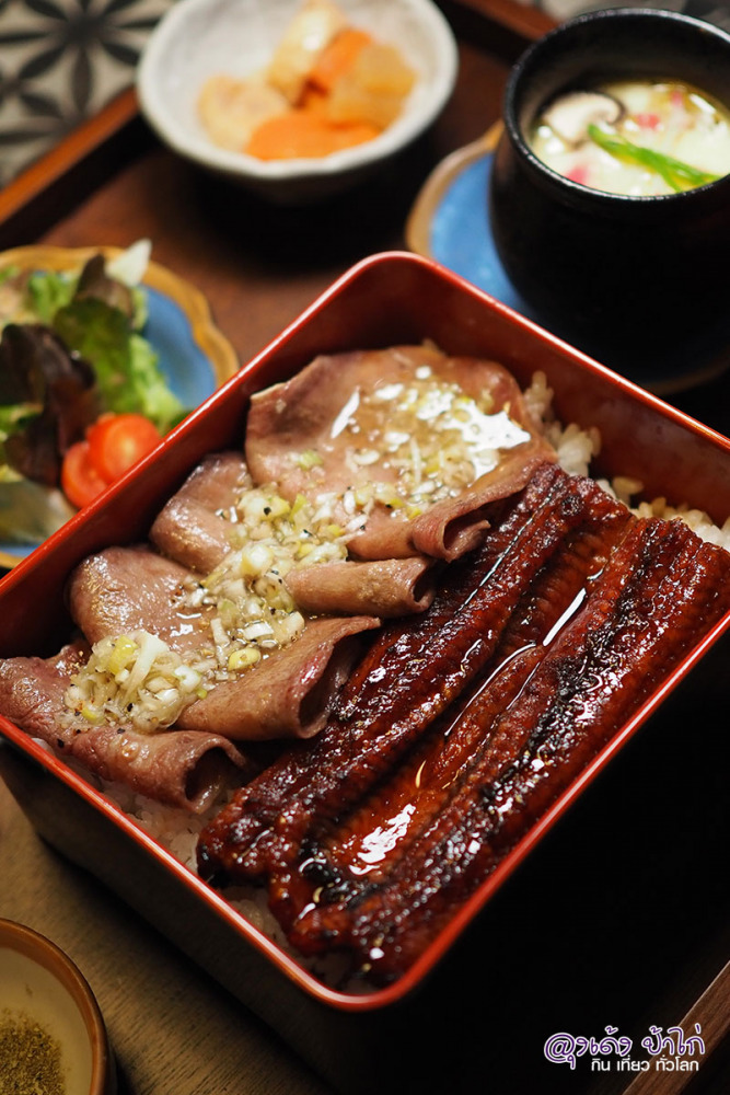 ชุดข้าวหน้าปลาไหลย่าง x ลิ้นวัวย่าง หนึ่งในสุดยอดเมนูของ Set Lunch - ในชุดเสิร์ฟพร้อม เครื่องเคียง ผักดอง มิโซะซุป ขาเขียว และของหวาน ทั้งหมดนี้ 600.-