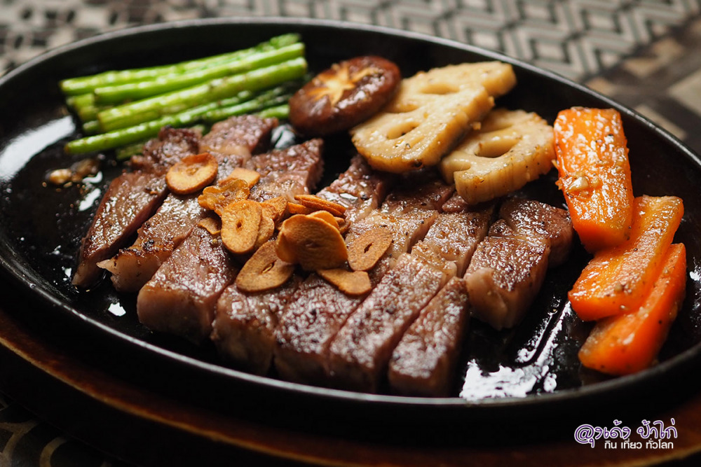สเต็กเนื้อวัวสัญชาติญี่ปุ่น ในราคาไม่ถึง 1 พัน ควรค่ามากครับ เสิร์ฟมาบรกระทะร้อน พร้อมผักรวมย่าง