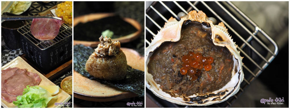 ลิ้นวัวย่าง 280.- | โอนิกิริแซลมอน 100.- | มันปูย่าง 320.-
