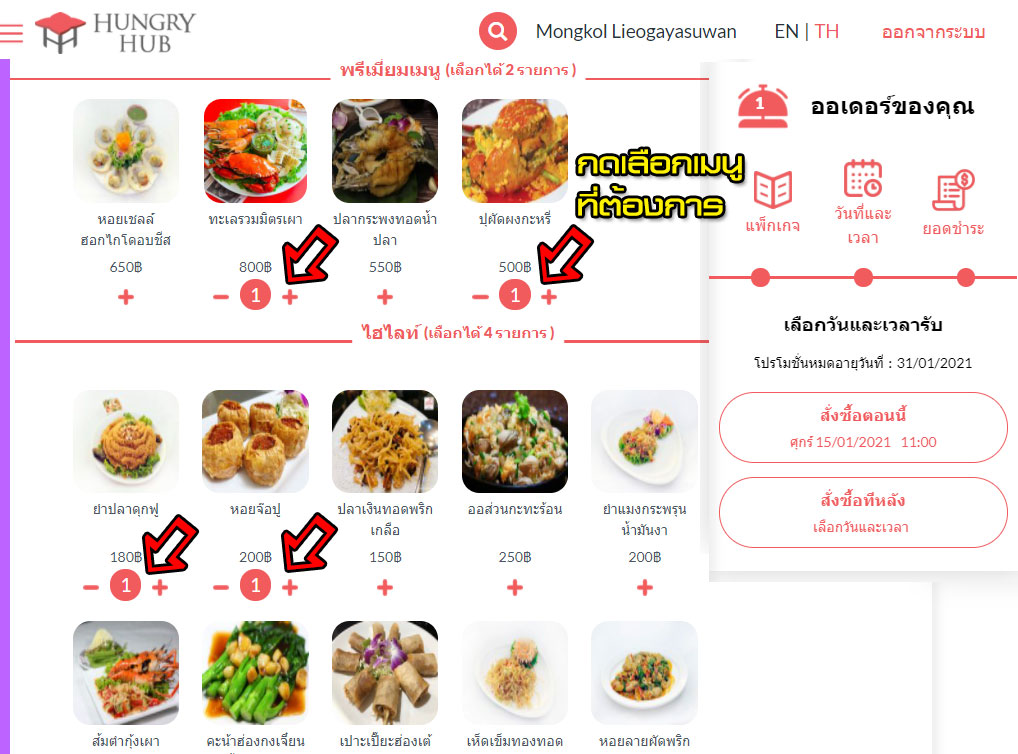 Login -> เลือกชื่อร้าน -> เลือก package ทีต้องการ -> เลือกรายการอาหาร แล้วทำตามขั้นตอน