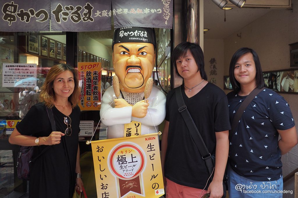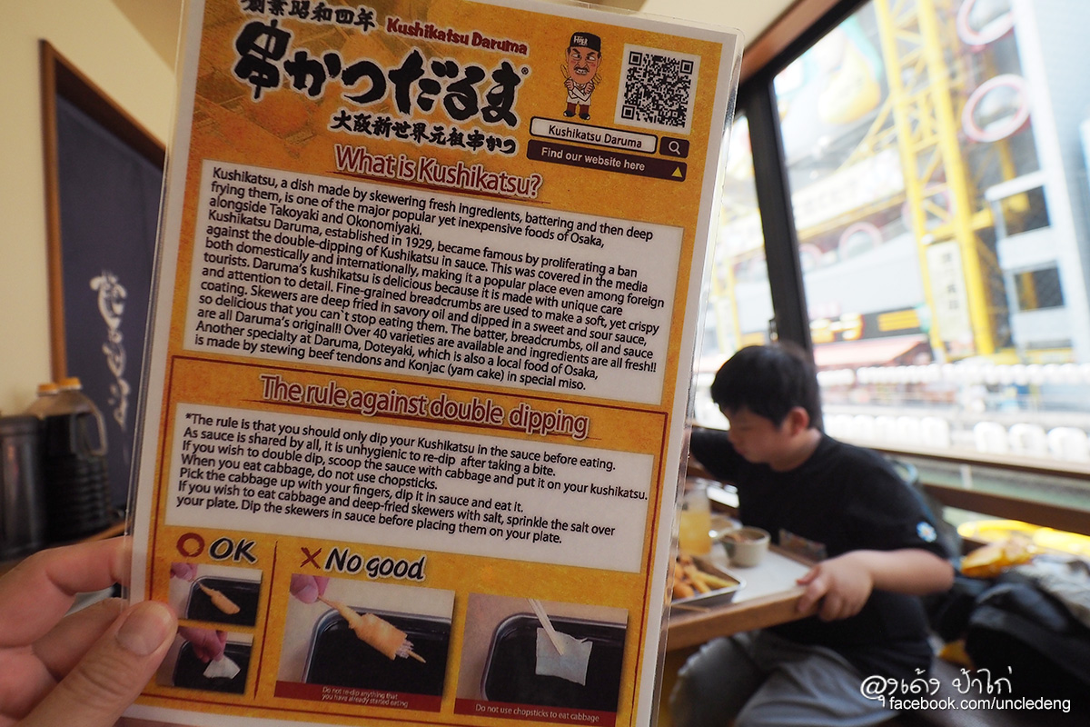 Dotonbori เป็นถนนแฟชั่น และสายอาหารยอดนิยมในโอซาก้า นักท่องเที่ยวที่มาเยือนเมืองนี้ก็จะต้องมาเดินย่านนี้กันทุกคน เพื่อถ่ายรูปกับป้ายไฟ Glico Man และในย่านนี้ก็เป็นถนนที่รวมร้านอร่อยไว้มากมาย และหนึ่งใน ร้านอาหารโอซาก้า ที่ลุงเด้ง ป้าไก่ จะพาไปรู้จักก็คือ Kushikatsu Daruma คุชิคัตสึ โดทมโบริ ร้านอาหารเสียบไม้ทอดเจ้าดังแห่งเมืองโอซาก้า