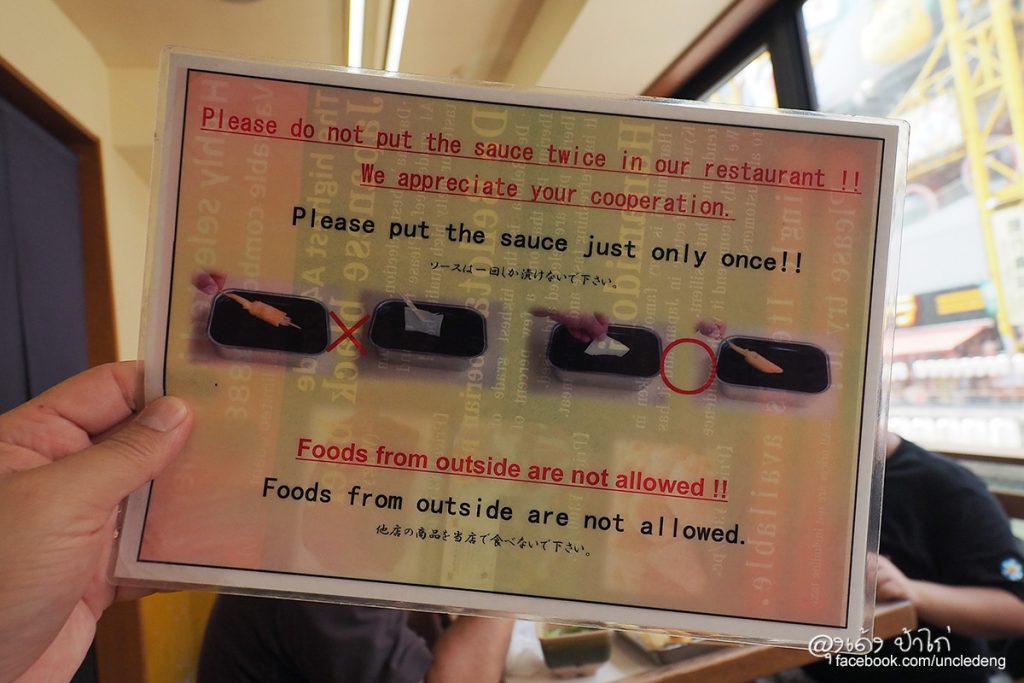 เรื่องของน้ำซอส คนญี่ปุ่นมีระเบียบ เค้าก็จะจุ่มครั้งเดียว เพราะฉนั้นใครจะมาทานต่อก็ไม่มีปัญหา และลุงเด้ง ป้าไก่ ก็เห็นพนักงานเค้าจะเอาตระแกรงมาช้อนเศษแป้งที่ตกอยู่ในน้ำซอส ก็ถ้าเราทำตามธรรมเนียมปฏิบัติก็ไม่มีปัญหาอะไร