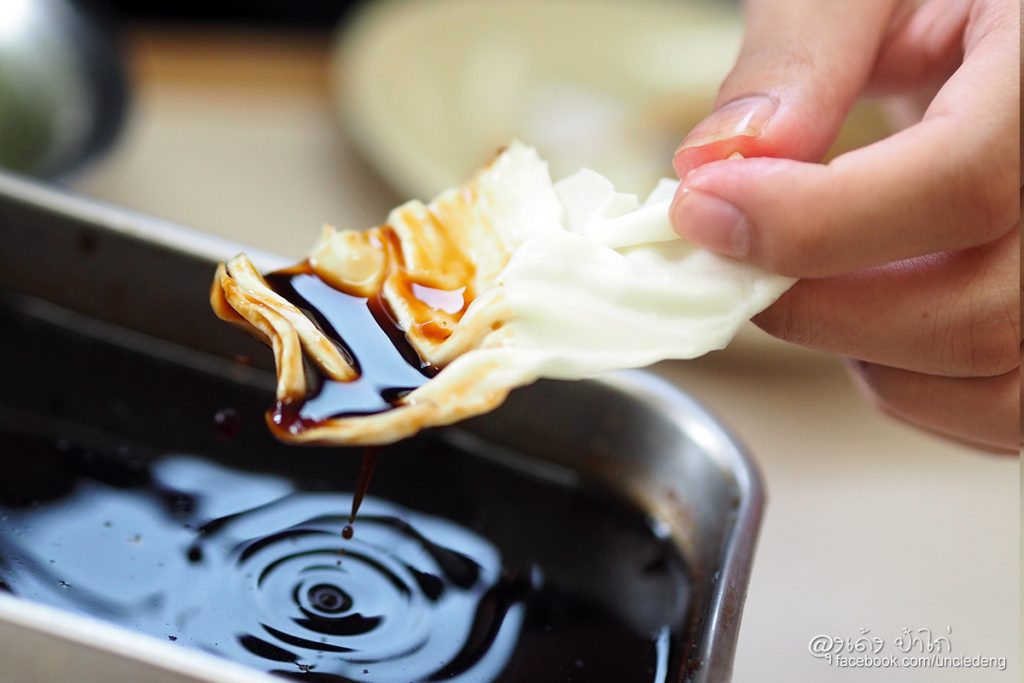 ถ้าน้ำซอสไม่พอ ให้วางของทอดในจานใบเล็ก แล้วนำผักกระหล่ำชิ้นใหญ่ที่วางอยู่ในชาม ลงไปตักน้ำซอสขึ้นมาราด (ผักกระหล่ำใช้ทานเป็นกับแกล้ม) บนโต๊ะจะมีเกลือ พริกไทย ก็นำมาโรยในจานของตัวเอง อย่าไปโรยในถาดใหญ่ และเมื่อกินแล้วไม้ให้นำไปใส่ไว้ในกระบอกไม้ไผ่