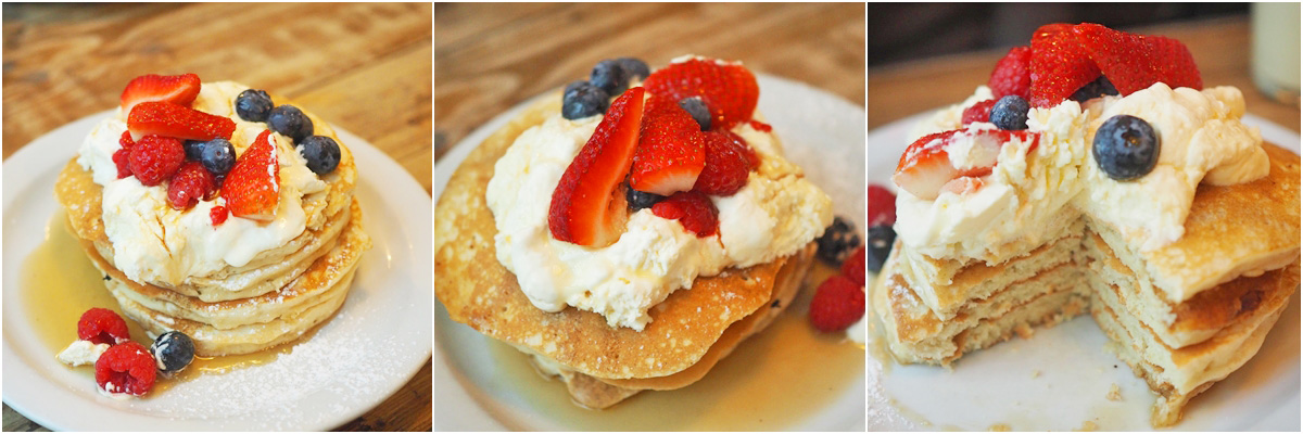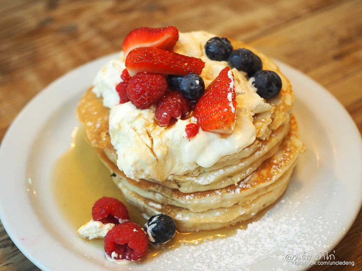 ป้าไก่จัดเต็มกับ Pancakes & Berries : Pancakes, berries, maple syrup & vanilla cream ราคา £ 9.50