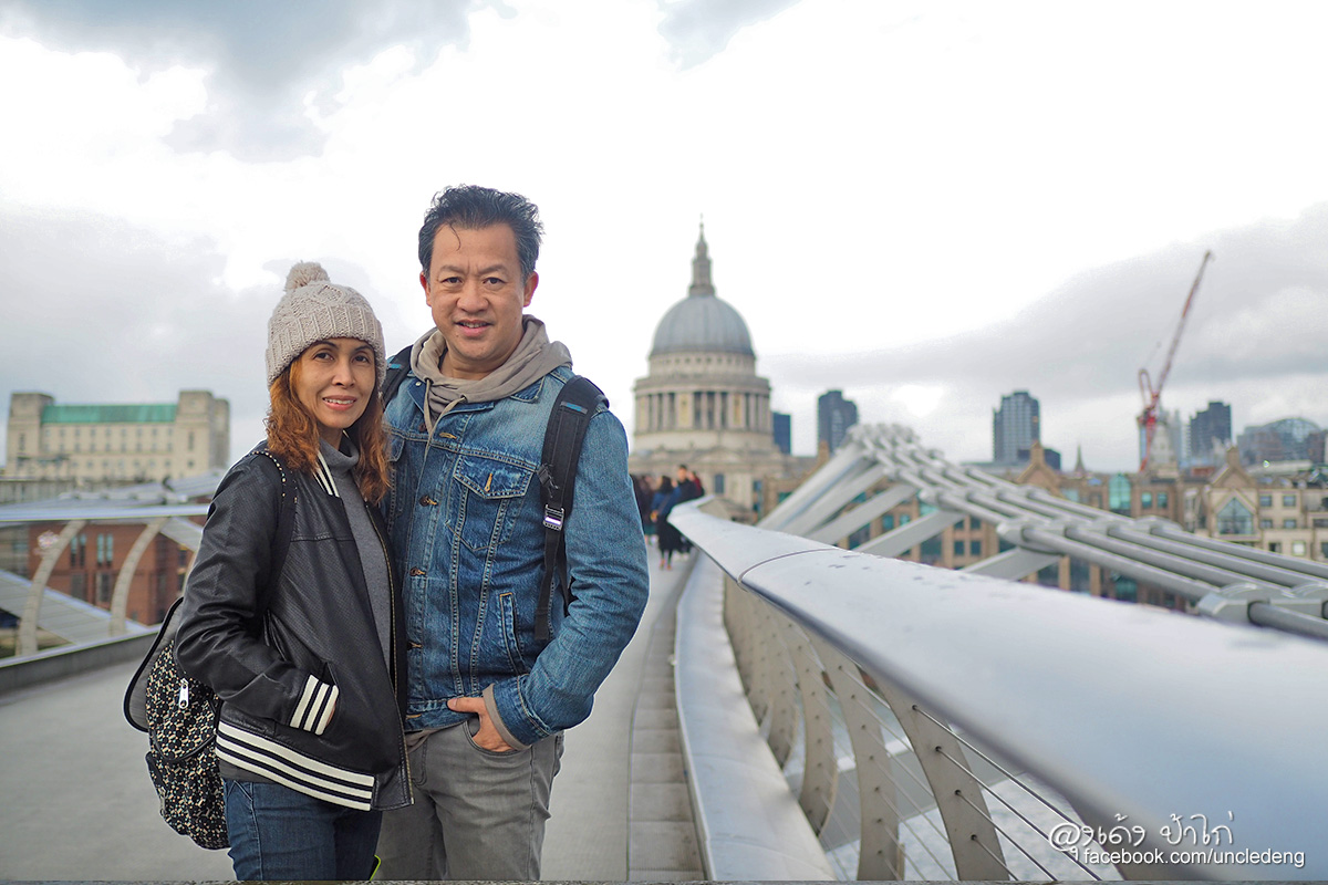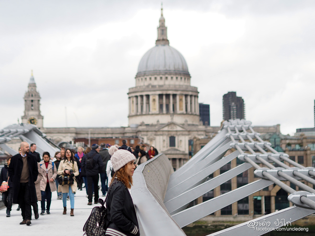 บนสะพาน Millennium Bridge มีนักท่องเทียวมาถ่ายรูปกันเยอะมาก ด้านหลังที่เห็นเป็นโดมคือ St Paul's Cathedral