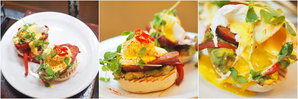 เช้านี้ ลุงเด้งเลือก HUEVOS AL BENNY : Poached eggs, peppers, avocado, chillies & hollandaise on English muffn with a choice of fried chicken or chorizo จานนี้ £10.5