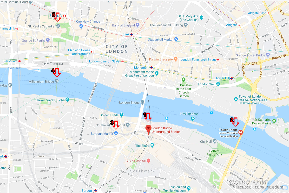 สถานี London Bridge มีสถานที่ท่องเที่ยวหลายแห่ง ตามแผนที่นี้ คือจุดที่ลุงเด้งป้าไก่ เดินไปถ่ายรูป ไกลพอสมควร อาศัย เดินๆ กินๆ พักๆ ก็ชิลดีครับ วิวสวย อากาศดี ไม่เหนื่อยครับ