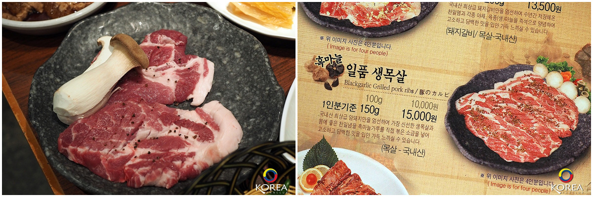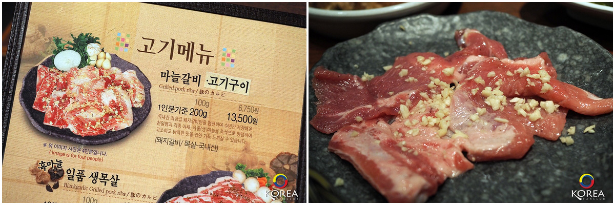 เมนูที่ขายดีที่สุด : Grilled Pork Ribs (เนื้อซี่โครงหมู กระเทียม) น้ำหนัก 200 กรัม ราคา 13,500 วอน