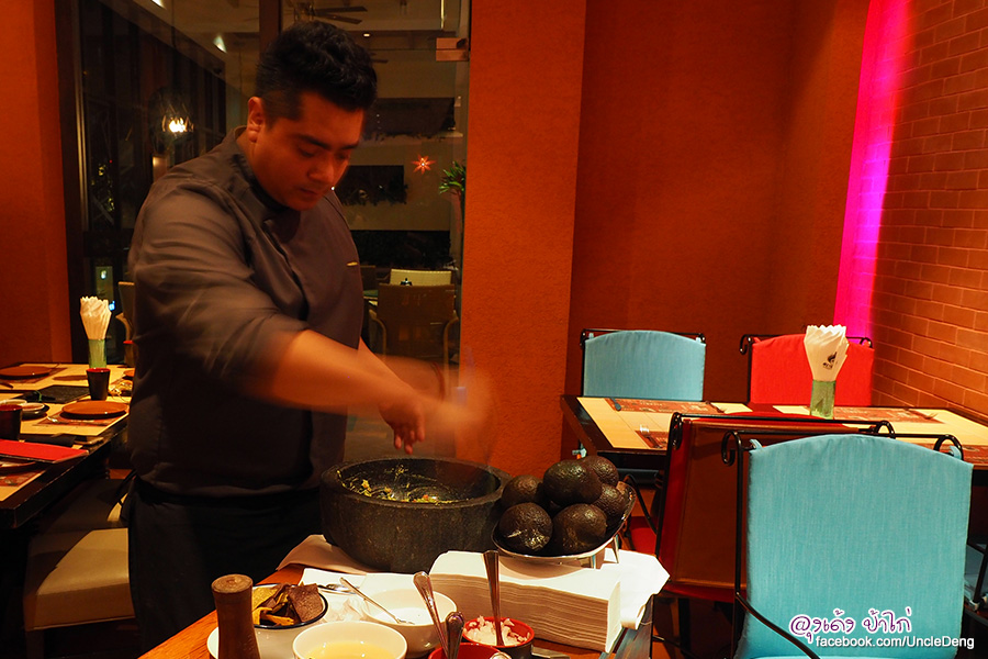 ทุกครั้งที่เราสั่ง Guacamole En Molcajete เชฟจะมาปรุงให้เราที่โต๊ะ วัตถุดิบหลักคือ อาโวคาโด เชฟ Carlos Bravo เลือกใช้อาโวคาโดที่ดีที่สุด นำเข้ามาจากต่างประเทศ เพราะให้เนื้อที่เนียน มันวาว รสชาติดี นำมาบทในครกหินปรุงรสด้วยเกลือ น้ำมะนาว หอมซอย มะเขือเทศ พริก และโรยหน้าด้วยผักชี
