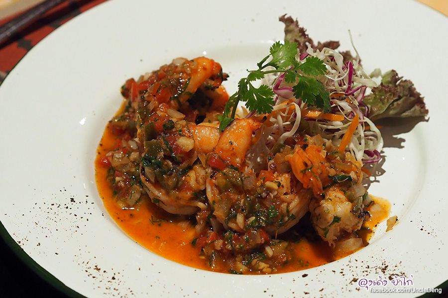 Pinchos De Camarones : กุ้งผัดกระเทียม ผักชี และพริกฮาลาปิโน ราคา 325.- จานนี้โดดเด่นที่ความหอมของสมุนไพรที่ปรุงมาในซอสที่ราดบนเนื้อกุ้งทะเล สด กรอบ เนื้อแน่น ตัวใหญ่เต็มคำ