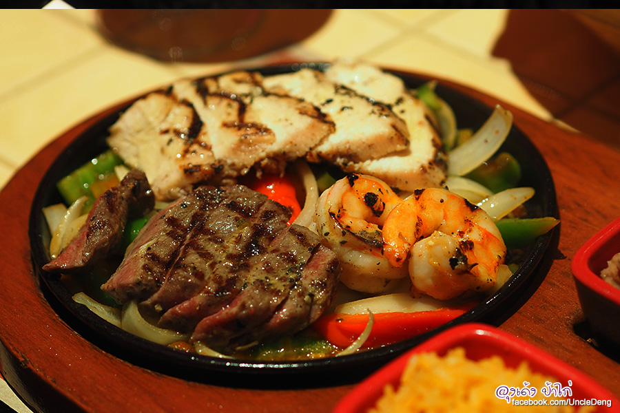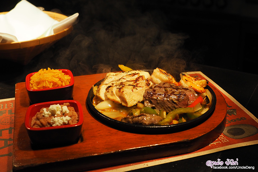 Fajitas เป็นอาหารจานร้อนยอดนิยมของอาหารแม็กซิกัน เนื้อย่างบนกระทะร้อน เสิร์ฟพร้อม ข้าว ถั่วบด และแผ่นแป้งตอติญ่า ชุดนี้ Fajitas Supreme (รวมไก่ เนิ้อวัว กุ้ง) ราคา 595.-