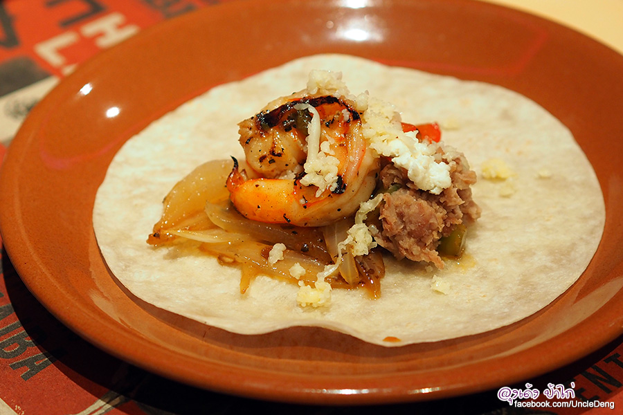วิธีการกิน Fajitas นำกุ้ง หรือเนื้อที่เราชอบวางลงบนแผ่นแป้งตอติญ่าตามด้วยผักที่ย่าง ใส่กัวคาโมเล่ ถั่วบด หรือข้าว ได้ตามชอบ แล้วก็ห่อใช้มือหยิบส่งเข้าปากได้ทันที