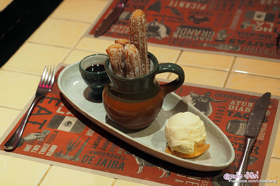 ปิดท้ายมื้อด้วย Churros ขนมประจำชาติสเปน ที่แพร่หลายในแม็กซิโก (อดีตแม็กซิโกเป็นเมืองขึ้นของสเปน) ขนมชูโรส เนื้อแป้งคล้ายขนมโดนัทแต่รูปร่างเป็นแท่งยาว ผิวนอกกรอบ เนื้อในเหนียวนุ่ม เครือบน้ำตาล เสิร์ฟมาพร้อมกับไอศกรีมวนิลา และซอสช็อกโกแลต เพิ่มความหวานมัน ราคา 195.-