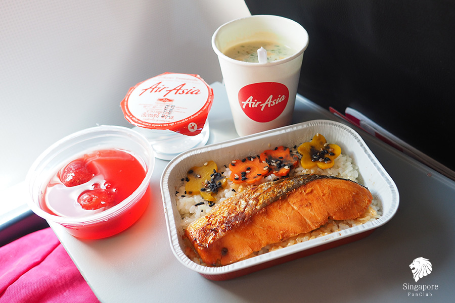 ขึ้นเครื่องก็จัด ปลาแซลมอนย่างพริกเกลือ เสิร์ฟมาพร้อมกับข้าวญี่ปุ่น ซุปมิโซะ และ เยลลี่สตรอเบอร์รี่