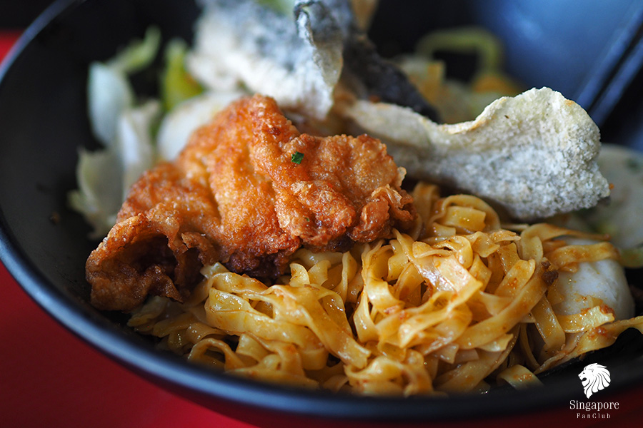 ความโดดเด่นของบะหมี่ชามนี้คือเส้นบะหมี่ไข่ คลุกกับน้ำพริกเผาแบบสิงคโปร์