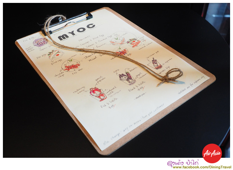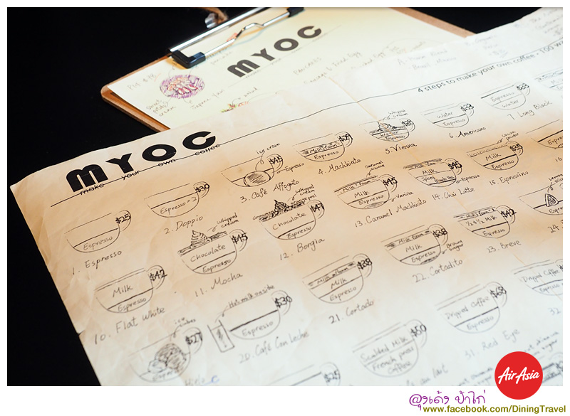 MYOC เป็นร้านเล็กๆ ขนาด 1 คูหา ในร้านที่มีนั่ง ประมาณ 12 - 14 ที่เท่านั้น เปิดตัวไปเมื่อวันที่ 25 กรกฏาคม 2558 ที่ผ่านมา MYOC ย่อมาจาก MAKE YOUR OWN COFFEE แน่นอนแล้วครับ ร้านนี้ต้องมีดีที่กาแฟ เมนูของที่ร้าน เป็นแผ่นกระดาษแขวนไว้ที่กำแพง และยังมีเมนูกาแฟ อีก 1 แผ่นให้ลูกค้าเลือกชิม โดยเมนูของที่ร้านจะมีภาพสเก็ต ของถ้วยกาแฟ ที่มีส่วนผสมต่างๆ รวมถึงภาพของอาหาร และขนมต่างๆ เขียนขึ้นด้วยมือทั้งหมด