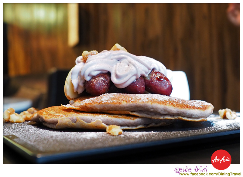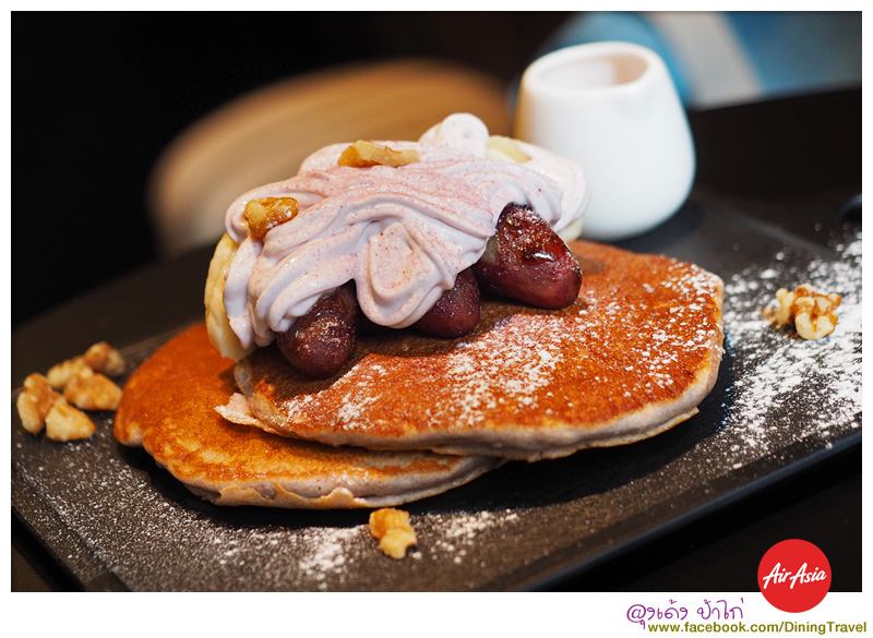 แพนเค้กมันม่วงญี่ปุ่น ประดับด้วย ครีมมันม่วง กล้วย และมันม่วงจากญี่ปุ่น จานนี้ 78 เหรียญ