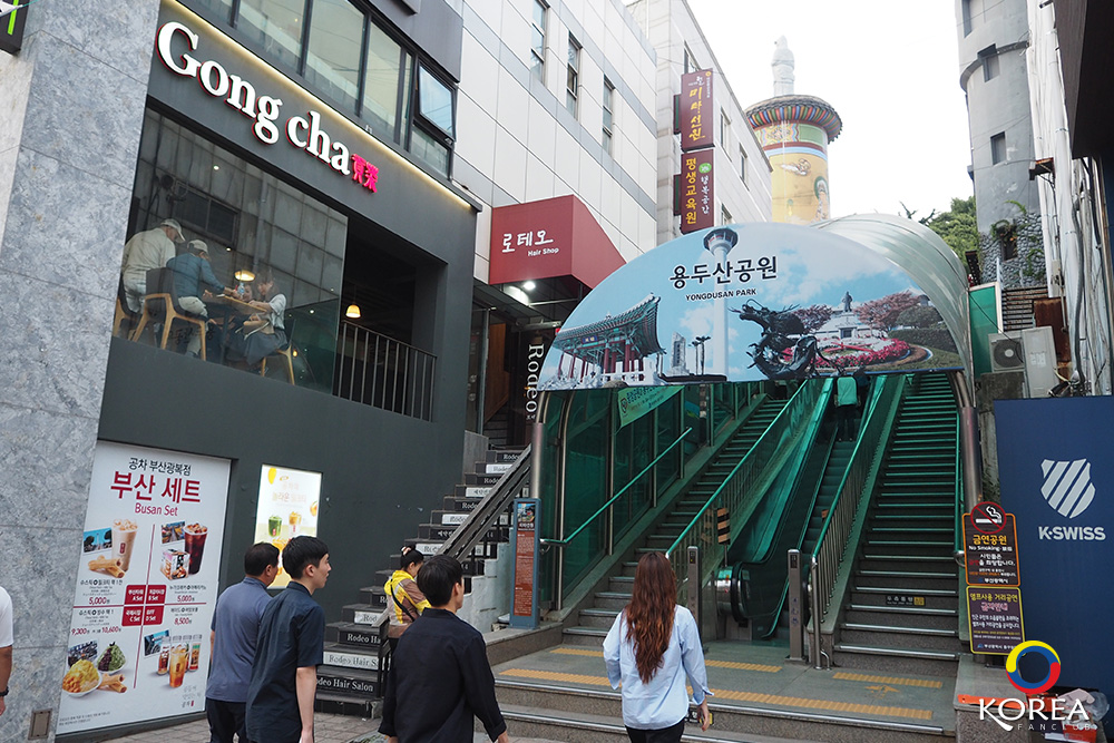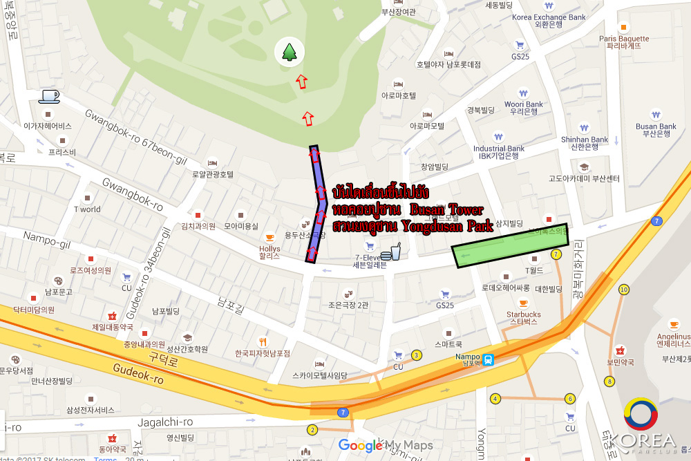 นัมโพดง Nampodong Shopping Street มีทางเชื่อมไปยัง หอคอยปูซาน (Busan Tower) ตั้งอยู่บนสวนยงดูซาน Yongdusan Park มีบันไดเลื่อนขึ้นสบายๆ ขาลงเราเดินลงนะครับ แต่ก็ไม่ได้ชันอะไรมากมาย (จุดขึ้น ให้ดูแผนที่ๆ ลุงเด้งป้าไก่ ทำให้อยู่ด้านล่างนี้)