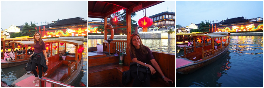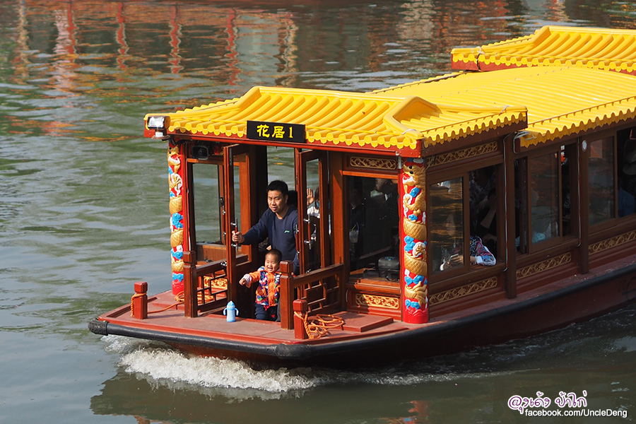 ล่องเรือแม่น้ำชิงไห่ Qinhuai River Cruise ช่วงเย็น ลุงเด้งป้าไก่ซื้อตั๋วล่องเรือชมความงดงามของวิวแม่น้ำ และร้านค้า บ้านเรือนตลอดเส้นทางของแม่น้ำ ขึ้นเรือที่ตรงข้ามวัดขงจื๊อ ค่าบริการคนละ 60 หยวน ใช้เวลาล่องเรือประมาณ 30 นาที