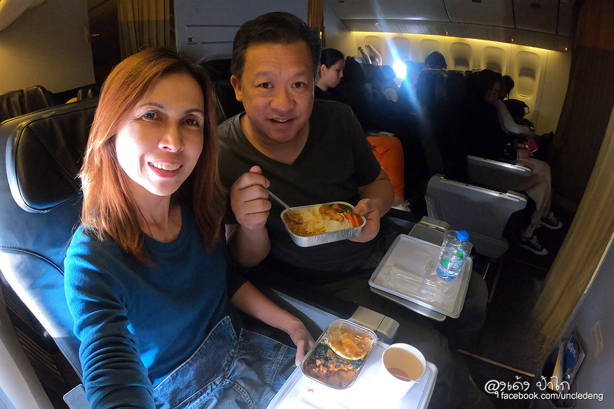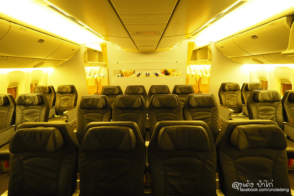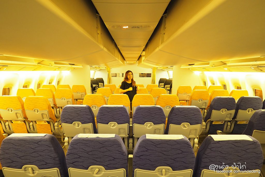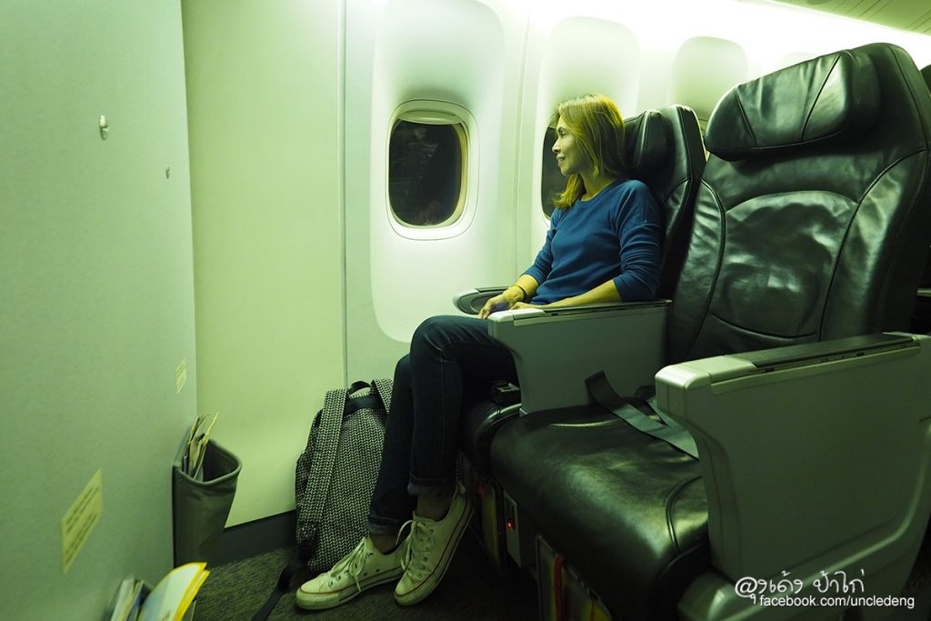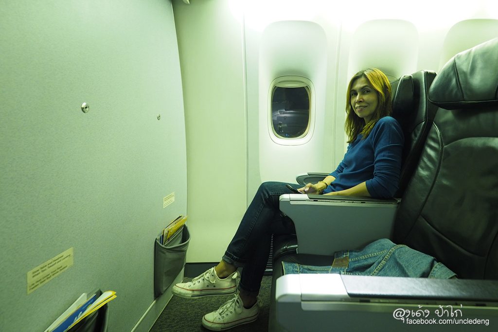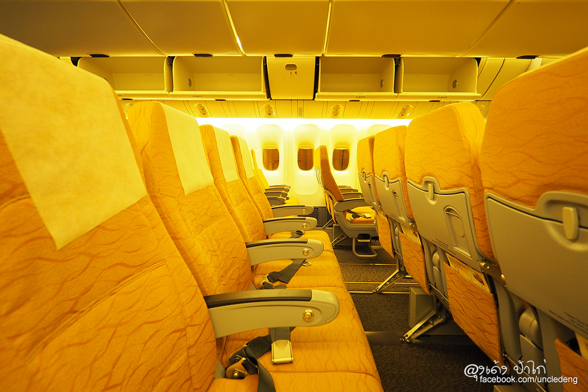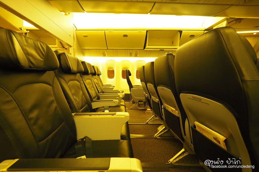 โบอิ้ง 777-200 เป็นเครื่องบินขนาดใหญ่ เบาะผู้โดยสารชั้นประหยัดมีขนาดใหญ่ นั่งสบาย ในภาพ ป้าไก่นั่งได้สบายๆ เหลือพื้นที่เหยียดขาได้อีกเยอะมาก บินไกลๆ ยังไงก็สบายกว่า ไม่อึดอัด เข่าไม่ชนเบาะ