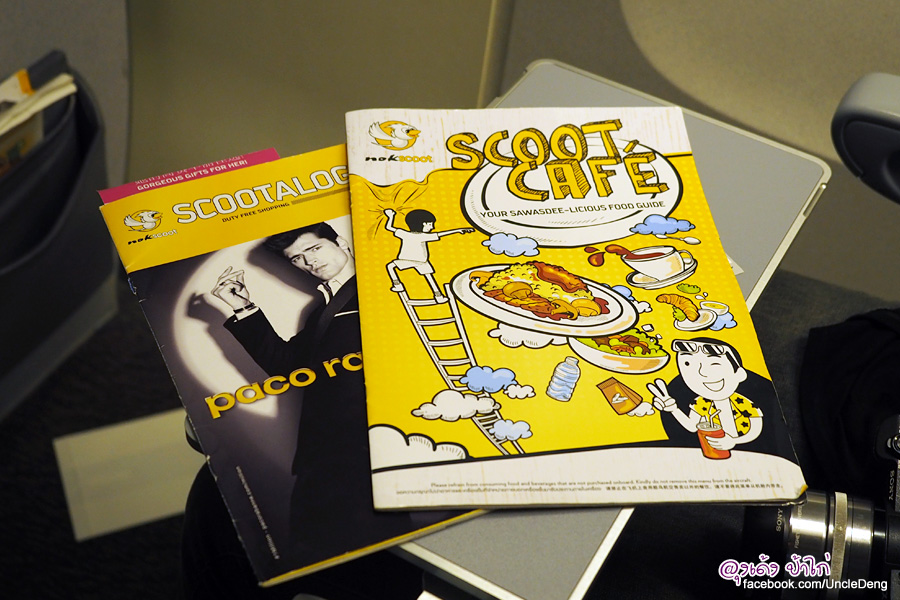 กระเป๋าเก็บสัมภาระหน้าที่นั่งมี Scootalog และ Scoot Cafe ให้เลือกชมสินค้า และสั่งซื้ออาหารบนเครื่อง