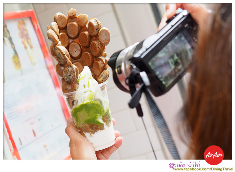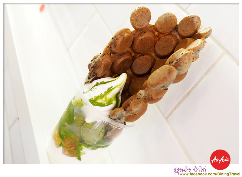 ยืนเลือกอยู่นาน เพราะร้านยังไม่เปิด ในที่สุดก็สั่ง THE MOB วาฟเฟิลบอลงาดำ กับ ไอศกรีมชาเขียว ราคา 55 เหรียญ รอประมาณ 15 นาที เพราะวาฟเฟิลบอล ทำสดๆ ทุกชิ้น 1 ถ้วย แบ่งกัน 2 คน จุกครับ เพราะเยอะมากๆ