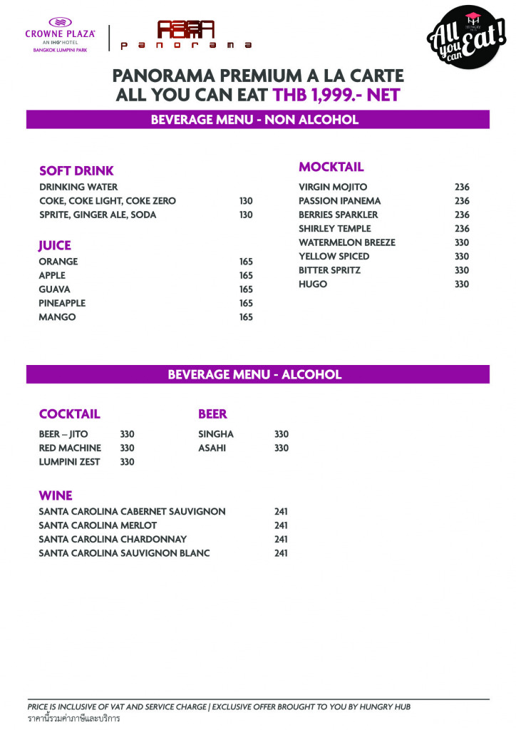 อาหารเหมือนกับโปร 1399.- แต่เพิ่มเติมเมนูเครื่องดื่ม ... Soft Drink | Juice | Mocktail | Cocktail | Beer | Wine รวมกว่า 25 รายการ ( บุฟเฟต์ พาโนรามา Hungry Hub )