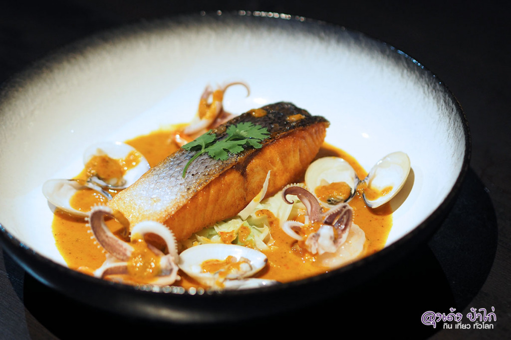 ปลาแซลมอนนิวซีแลนด์ย่าง เสิร์ฟพร้อมซอสต้มยำกุ้งรสจัดจ้าน พร้อมด้วยกุ้ง & หอยตลับ