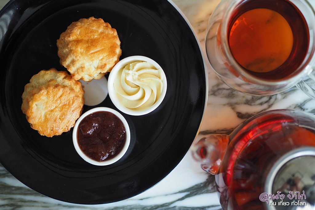 ชุดนี้ก็จะมี 3 ชั้น ๆ แรก (ล่างสุด) จะเป็น สโคน 2 ชิ้น กินกับครีมเนยสด + แยมสตรอเบอรี่