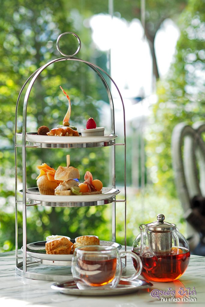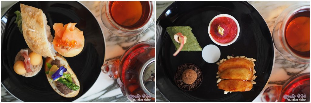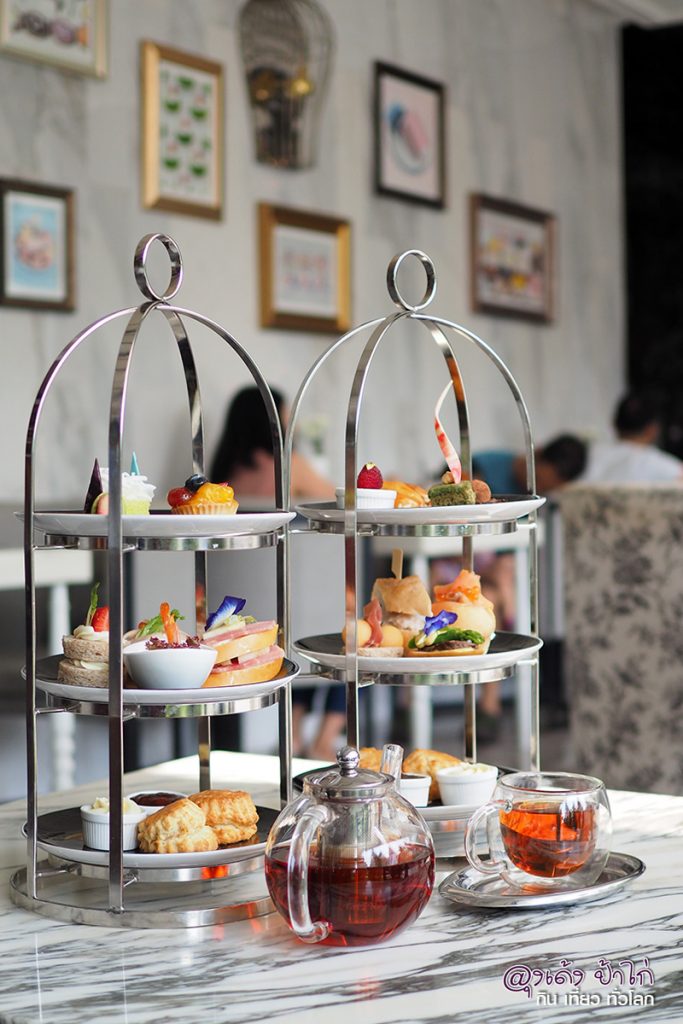 ชั้นที่ 2 จะเป็น ชุดของคาว มีทั้งหมด 4 ชิ้น และ ชั้นบนสุด จะเป็น ชุดของหวาน 4 ชิ้น ในชุดจะมี ชาร้อน 1 กา (เติมน้ำร้อนเพิ่มได้) มีชาให้เลือกหลายรสหลายกลิ่น