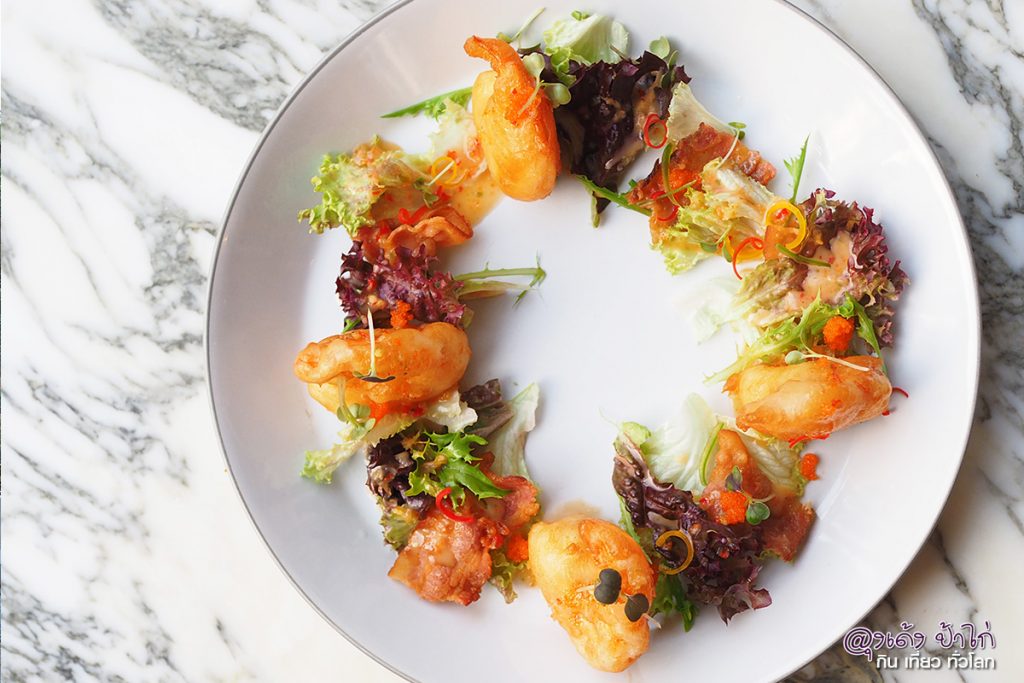 สวยงามมั๊ย! ... เหมือนเดินเล่นอยู่ในสวนเลยล่ะ "East Meet West Salad" จานนี้ 280.- ในจานประกอบด้วย กุ้งชุปแป้งทอด + เบคอนทอด และ ผักสด พร้อมกับ ซอสเผ็ด