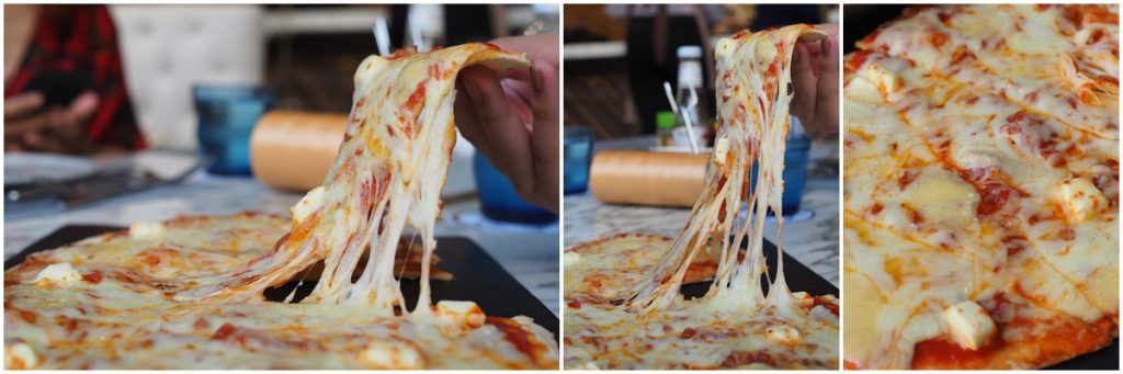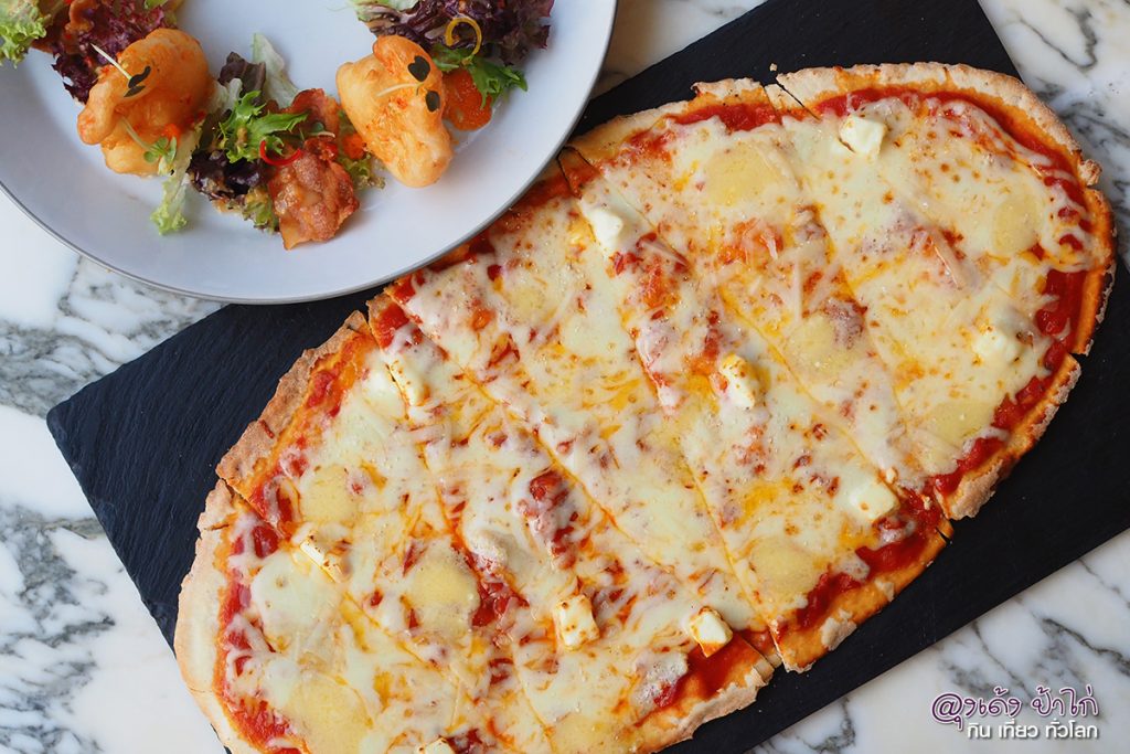 ขนมปังฟอคคาเชีย จะมีรูปร่างแบน สัญชาติอิตาลี แต่ร้านนี้ ปรับมาเป็นแป้งบางๆ แบบพิซซ่า ใส่ชีส 4 ชนิด สัมผัสแรกที่รับได้คือ ความหอมมันของชีสทั้ง 4 ชนิด