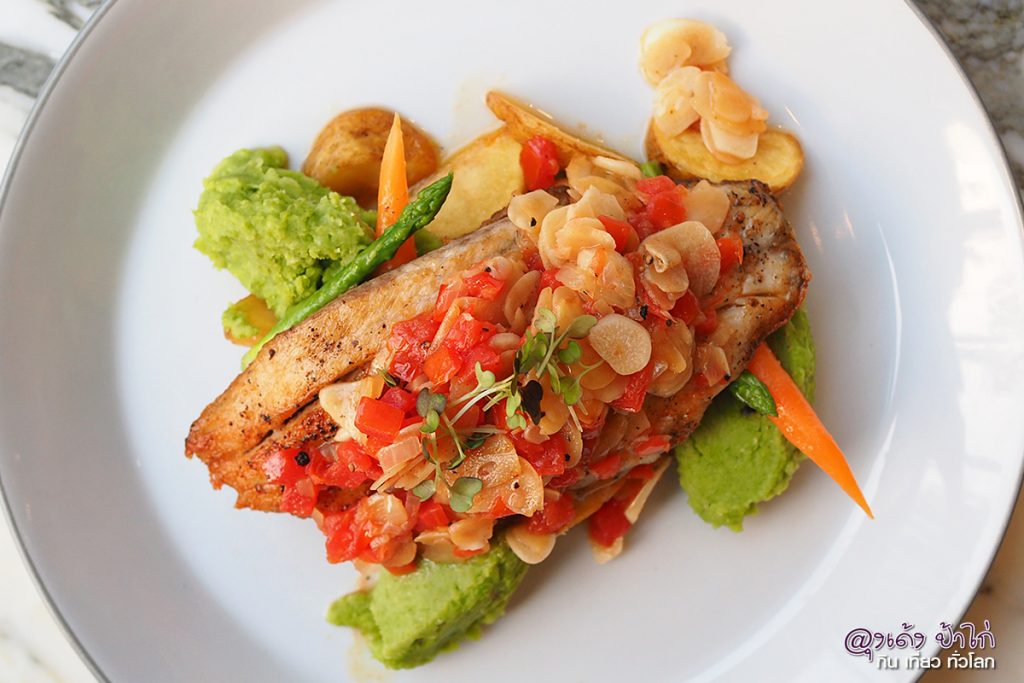 Pan-Fried Seabass 420.- ปลากระพงย่าง ราดซอสกระเทียมมะเขือเทศ กินกับมันบด และถั่วบด