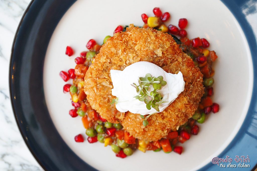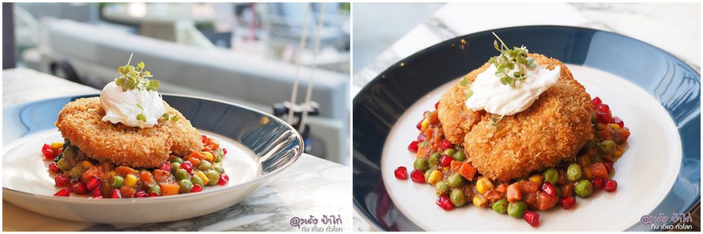 เนื้อหมูชิ้นโต ชุดเกร็ดขนมปังทอดจนสีเหลืองทอง วางบน 3 สี (ถั่วลันเตา+แครอท+ข้าวโพด) + เมล็ดทับทิม ราดด้วยซอสมัสตาร์ต Topping ด้วย poached egg (ไข่ต้มในน้ำ) จานนี้ 450.-
