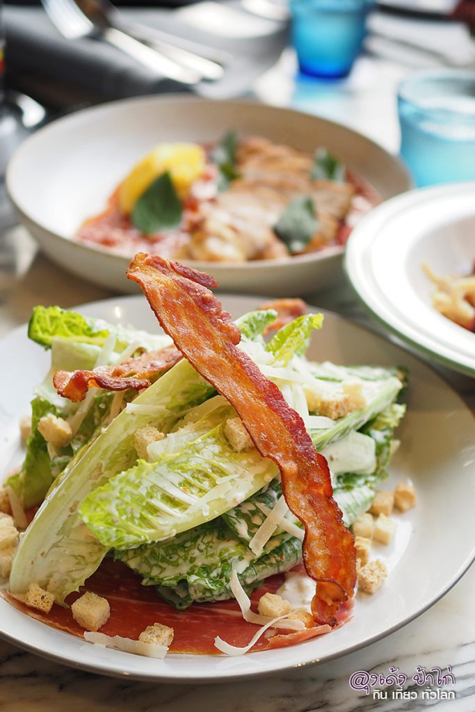 เมนูป้าไก่ ... Caesar Salad 320.- ตอนที่พนักงานยกมาเสิร์ฟ แอบนึกในใจ ... แพงอ่ะ! แต่ พอกินไปซักพัก - เฮ้ย... มี พาม่าแฮม วางอยู่ก้นจาน? อ้าว... ไม่แพงแล้วล่ะ 555 ( ของแพงซ่อนอยู่ใต้ผักซะงั้น)